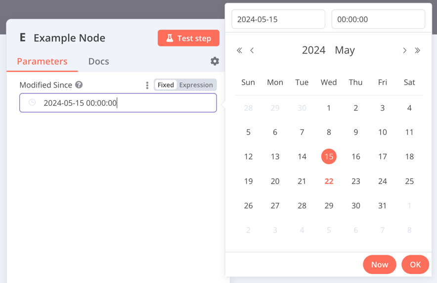 {displayName:'Modified Since',name:'modified_since',type:'dateTime',default:'',description:'The date and time when the file was last modified',displayOptions:{// the resources and operations to display this element withshow:{resource:[// comma-separated list of resource names],operation:[// comma-separated list of operation names]}},}