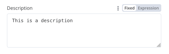 {displayName:'Description',name:'description',type:'string',required:true,typeOptions:{rows:4,},default:'',description:'Description',displayOptions:{// the resources and operations to display this element withshow:{resource:[// comma-separated list of resource names],operation:[// comma-separated list of operation names]}},}